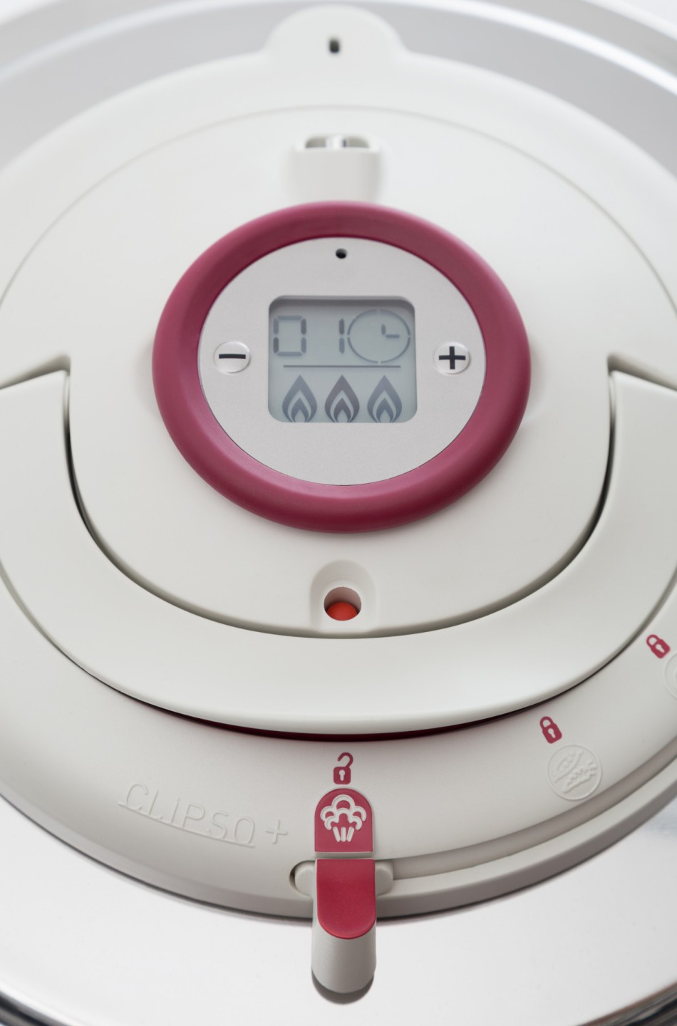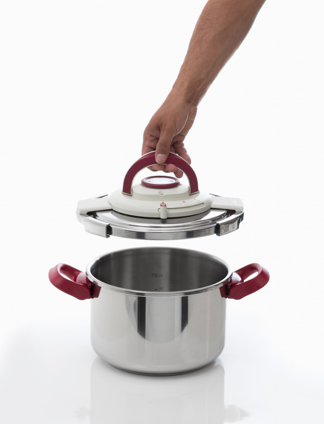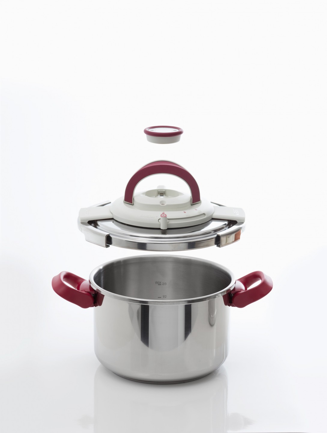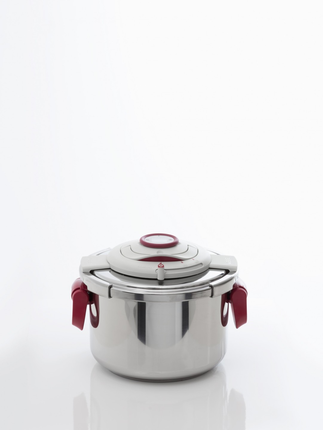 The Clipso+ Précision is a new-generation pressure cooker that can be handled, opened and closed with just one hand. The parts that come into contact with the hands: the handles, slider and timer, are bright red for a cheerful look and to emphasise how easy it is to use.
