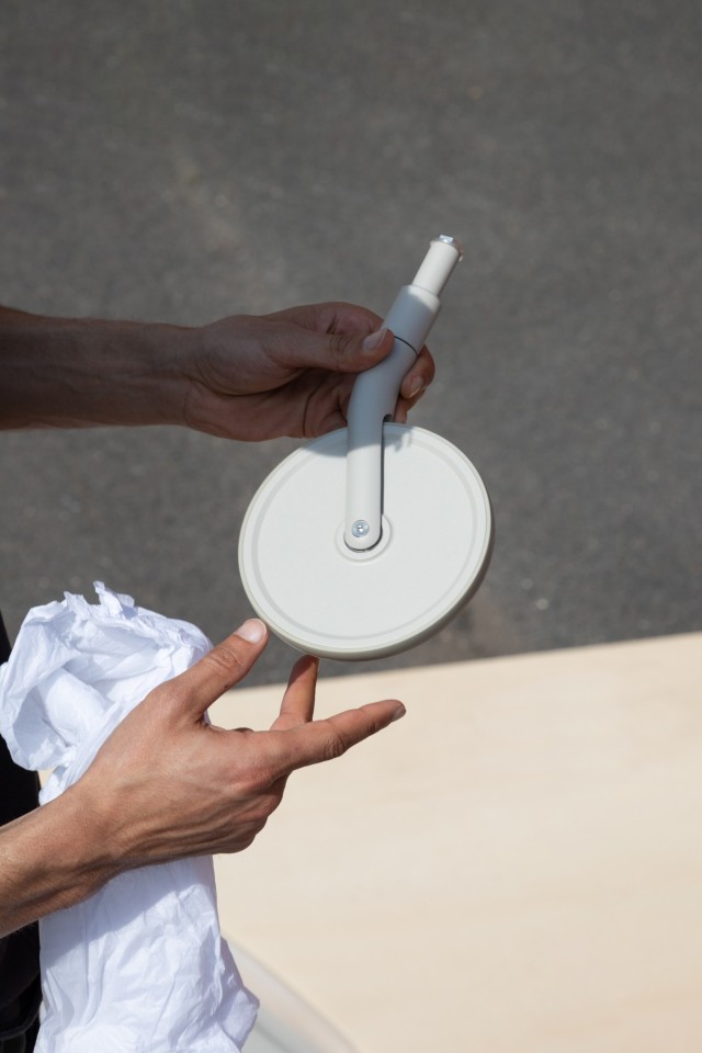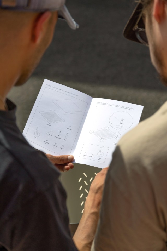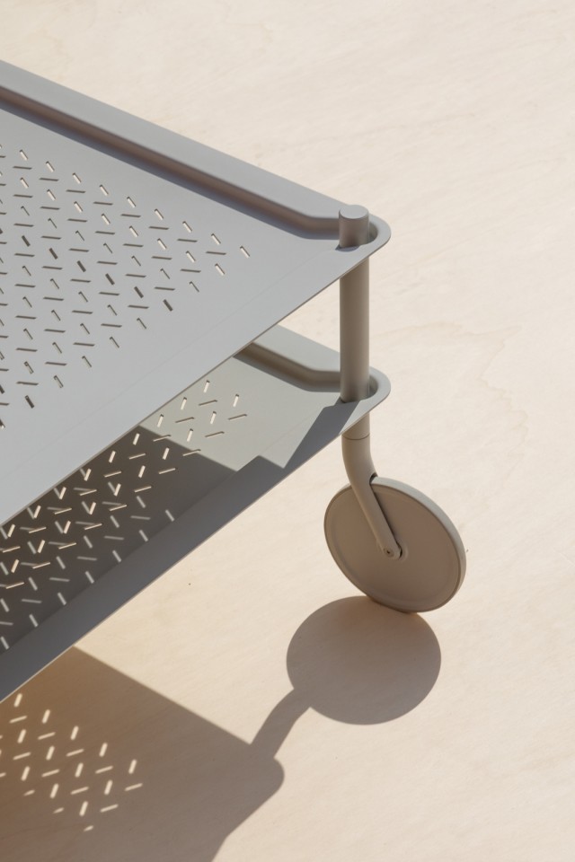 Rolling coffee table made up of two 1m² stamped and perforated trays. Treated against corrosion, it can be used both indoors and outdoors. It is delivered flat-packed and is easy to assemble.