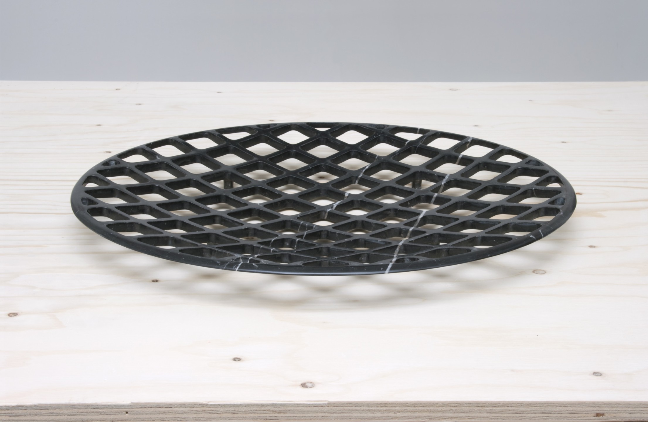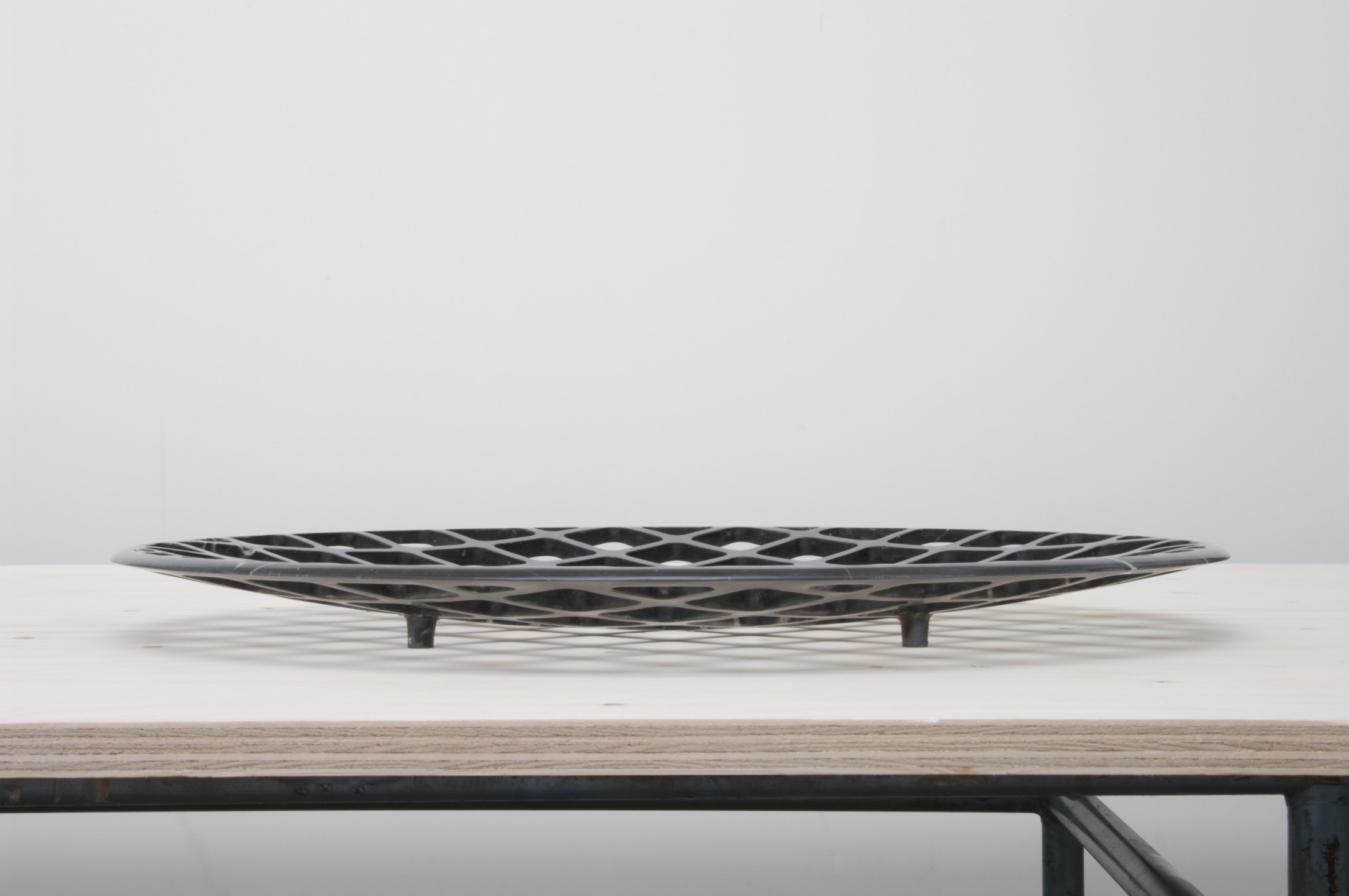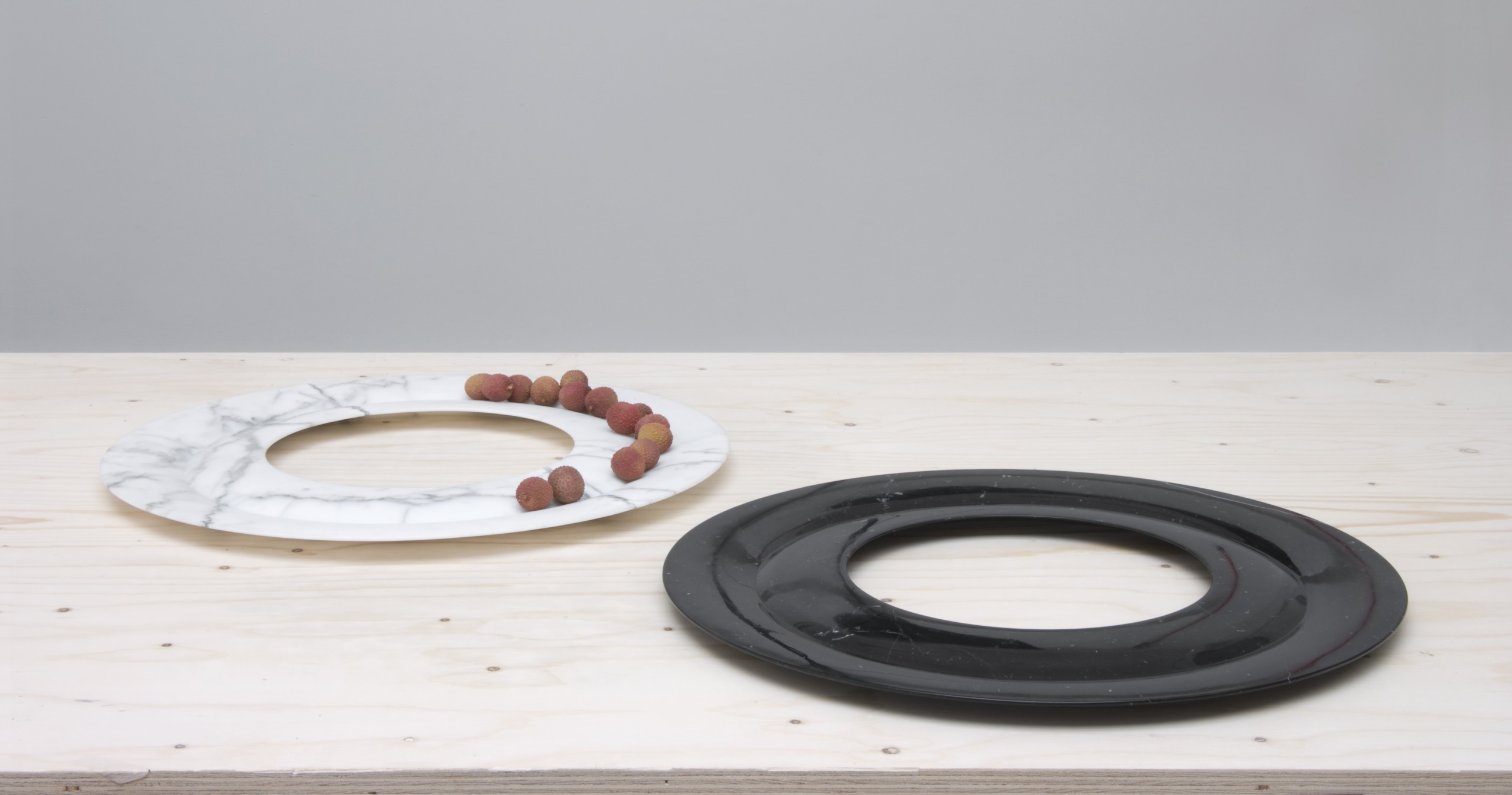 Coupes en marbre noir ou blanc à profil en “V”. Le marbre est usiné jusqu’à devenir le plus fin possible. Diamètre 60 cms. Édition limitée à 8 exemplaires, 2 prototypes et 2 exemplaires d’artiste. Pièces numérotées et signées.