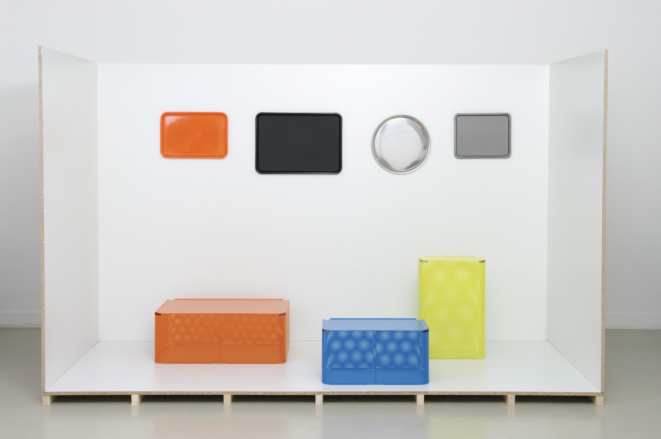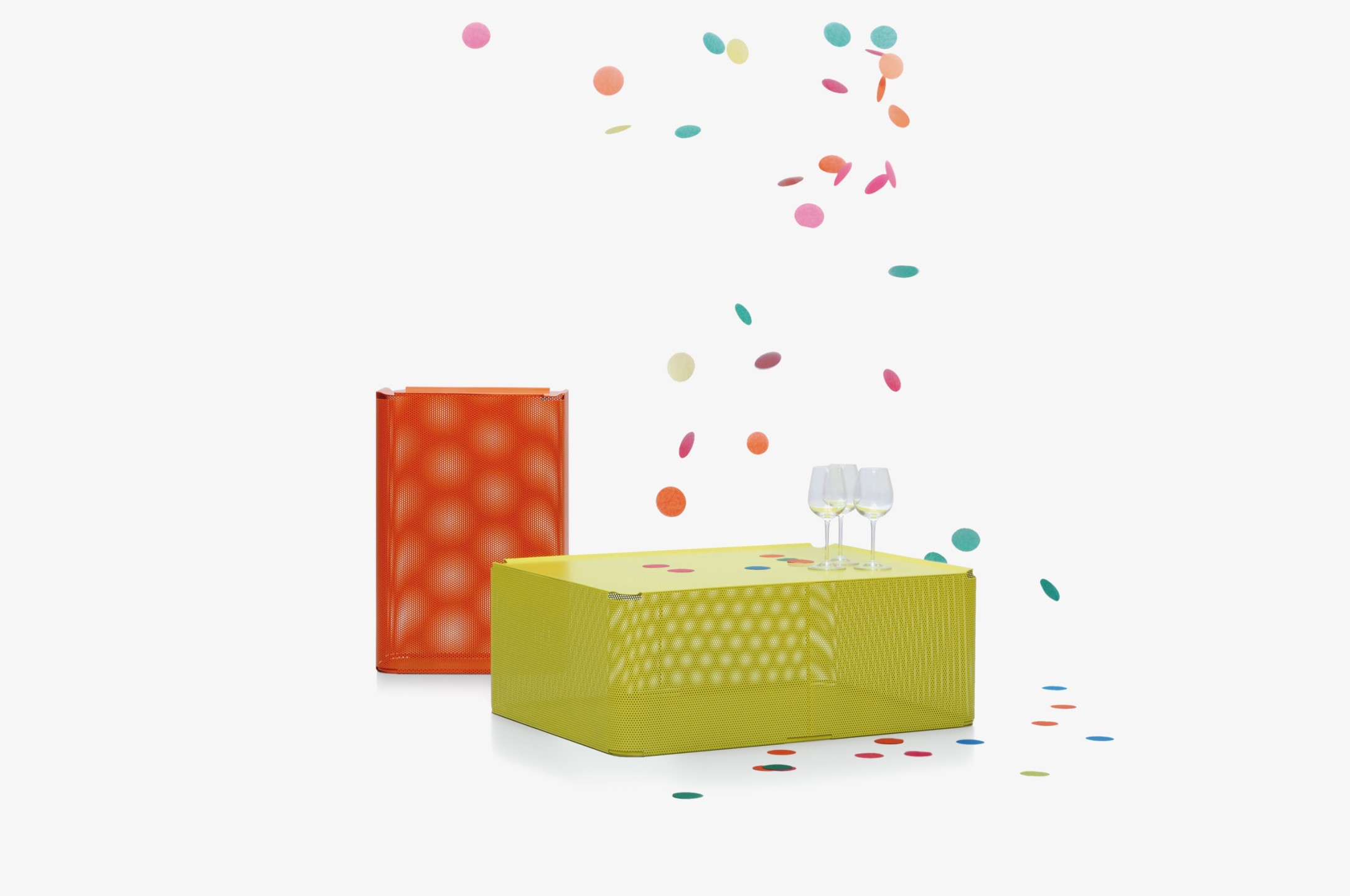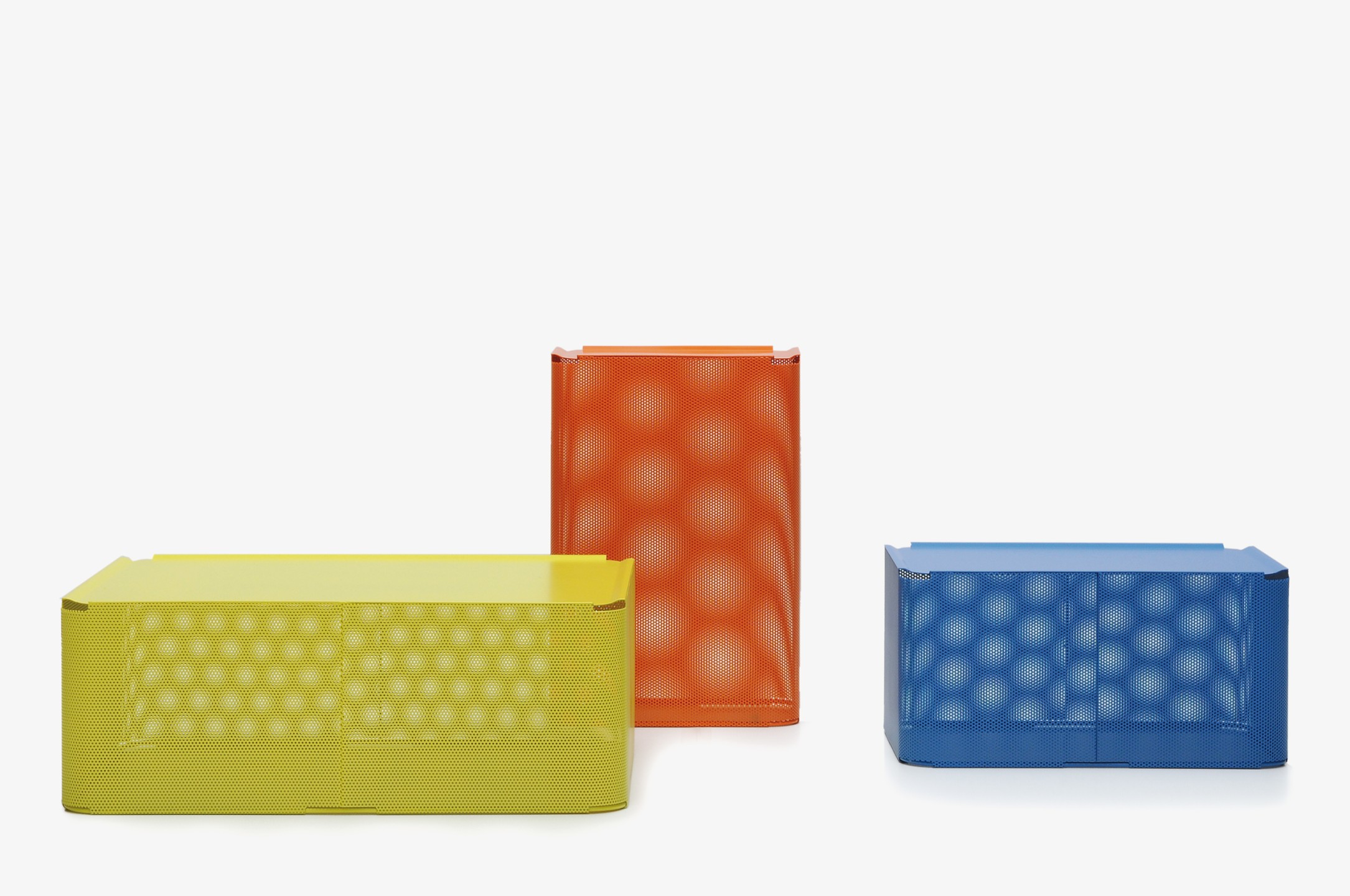 Ces 3 tables basses sont constituées de deux coques en tôle perforée et forment un volume léger autour d’un plateau à bords pliés. Elles évoquent un plateau de “service” et se déclinent en 3 tailles offrant de multiples usages.